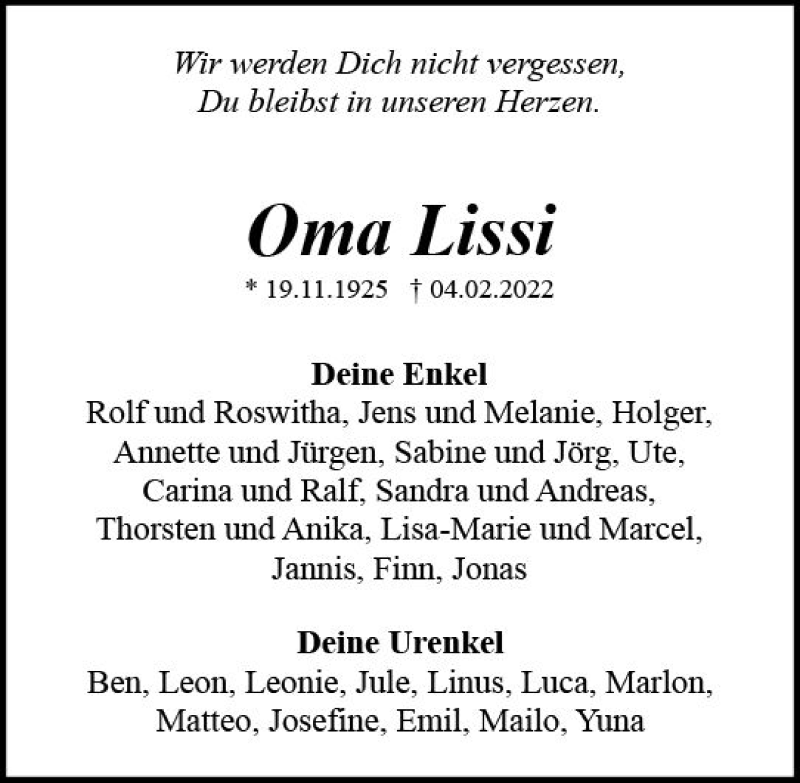 Hier finden Sie alle Traueranzeigen aus der Zeitung, die bisher für Lissi erschienen sind. Weitere Traueranzeigen, die in der Zeitung erscheinen, werden hier ebenfalls aufgelistet