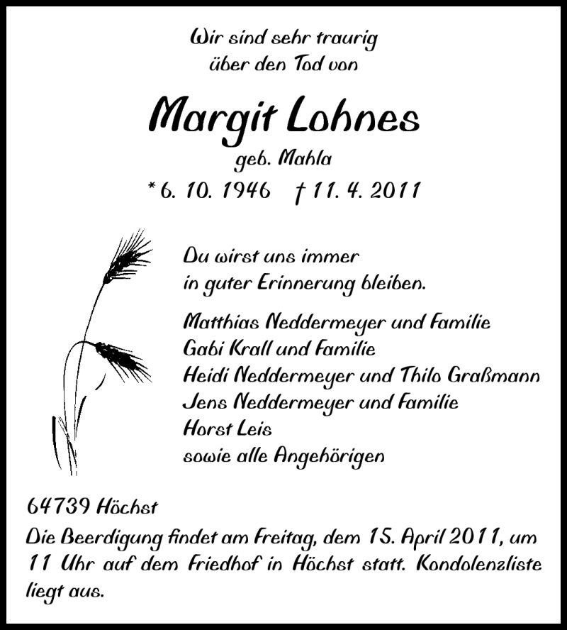 Hier finden Sie alle Traueranzeigen aus der Zeitung, die bisher für Lohnes Margit erschienen sind. Weitere Traueranzeigen, die in der Zeitung erscheinen, werden hier ebenfalls aufgelistet