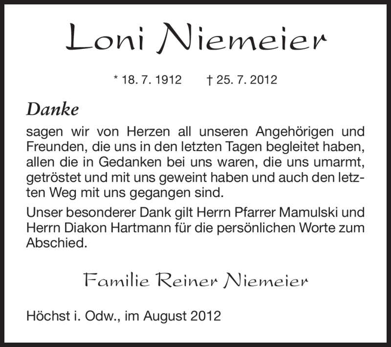 Hier finden Sie alle Traueranzeigen aus der Zeitung, die bisher für Loni Niemeier erschienen sind. Weitere Traueranzeigen, die in der Zeitung erscheinen, werden hier ebenfalls aufgelistet