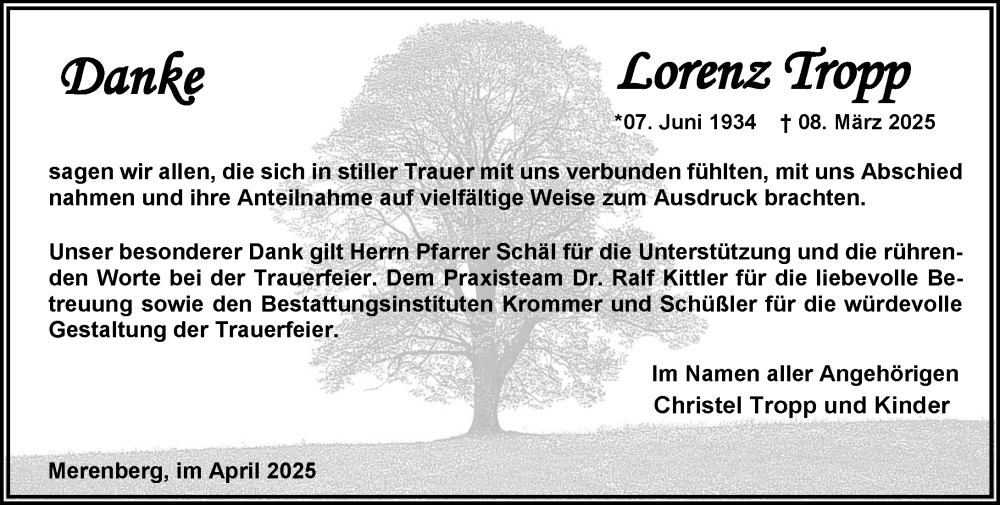Hier finden Sie alle Traueranzeigen aus der Zeitung, die bisher für Lorenz Tropp erschienen sind. Weitere Traueranzeigen, die in der Zeitung erscheinen, werden hier ebenfalls aufgelistet