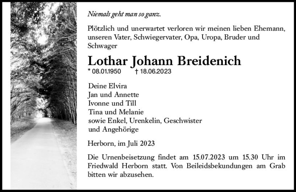 Hier finden Sie alle Traueranzeigen aus der Zeitung, die bisher für Lothar Johann Breidenich erschienen sind. Weitere Traueranzeigen, die in der Zeitung erscheinen, werden hier ebenfalls aufgelistet