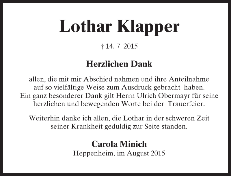 Hier finden Sie alle Traueranzeigen aus der Zeitung, die bisher für Lothar Klapper erschienen sind. Weitere Traueranzeigen, die in der Zeitung erscheinen, werden hier ebenfalls aufgelistet