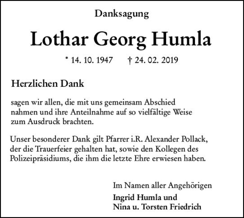 Hier finden Sie alle Traueranzeigen aus der Zeitung, die bisher für Lothar Georg Humla erschienen sind. Weitere Traueranzeigen, die in der Zeitung erscheinen, werden hier ebenfalls aufgelistet