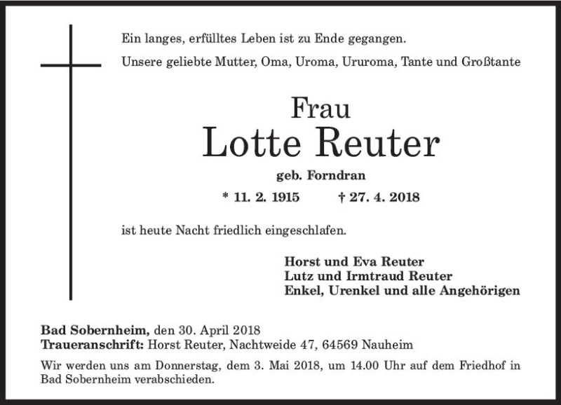 Hier finden Sie alle Traueranzeigen aus der Zeitung, die bisher für Lotte Reuter erschienen sind. Weitere Traueranzeigen, die in der Zeitung erscheinen, werden hier ebenfalls aufgelistet