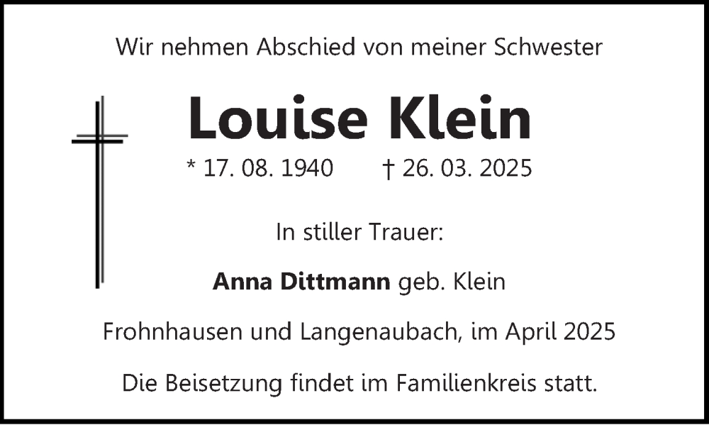 Hier finden Sie alle Traueranzeigen aus der Zeitung, die bisher für Louise Klein erschienen sind. Weitere Traueranzeigen, die in der Zeitung erscheinen, werden hier ebenfalls aufgelistet