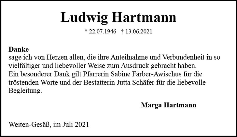 Hier finden Sie alle Traueranzeigen aus der Zeitung, die bisher für Ludwig Hartmann erschienen sind. Weitere Traueranzeigen, die in der Zeitung erscheinen, werden hier ebenfalls aufgelistet