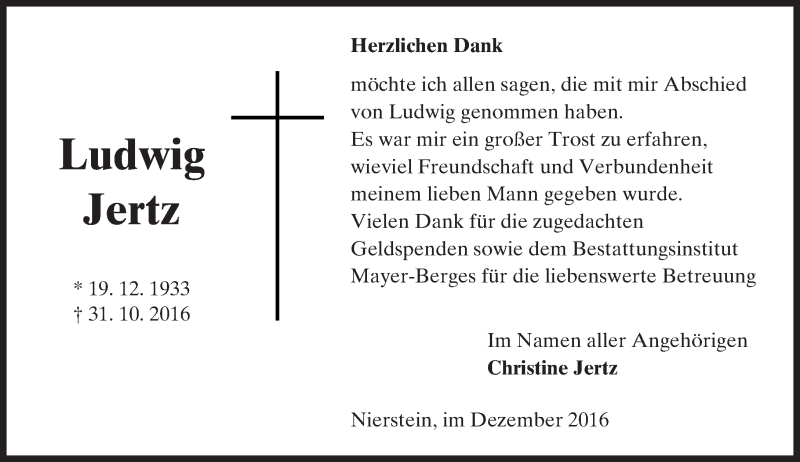 Hier finden Sie alle Traueranzeigen aus der Zeitung, die bisher für Ludwig Jertz erschienen sind. Weitere Traueranzeigen, die in der Zeitung erscheinen, werden hier ebenfalls aufgelistet