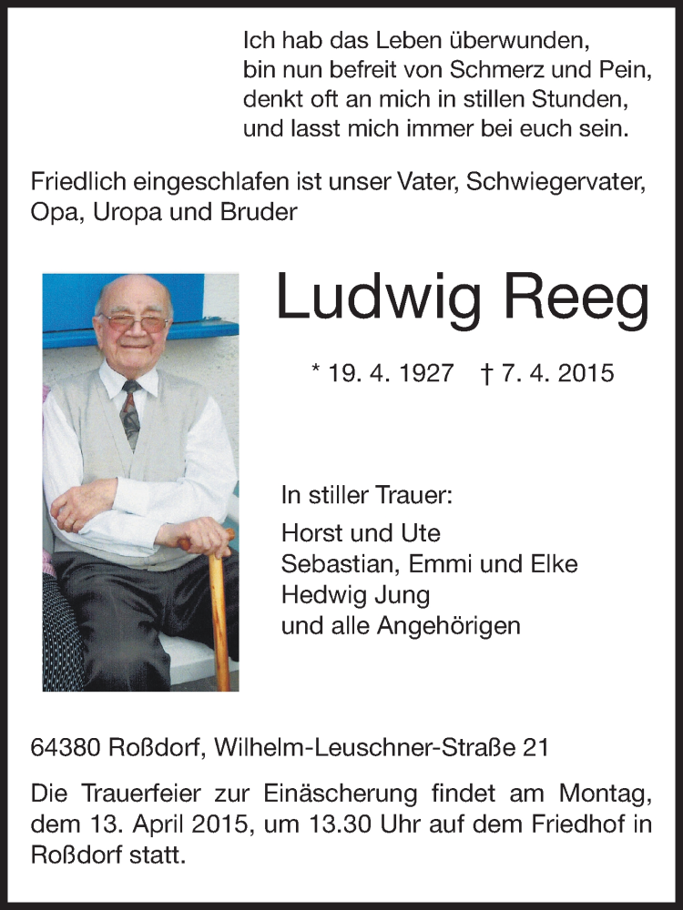 Hier finden Sie alle Traueranzeigen aus der Zeitung, die bisher für Ludwig Reeg erschienen sind. Weitere Traueranzeigen, die in der Zeitung erscheinen, werden hier ebenfalls aufgelistet