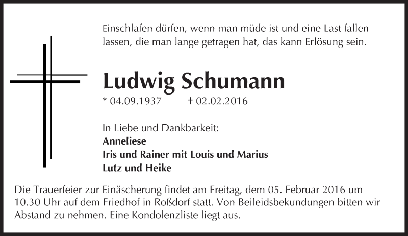 Hier finden Sie alle Traueranzeigen aus der Zeitung, die bisher für Ludwig Schumann erschienen sind. Weitere Traueranzeigen, die in der Zeitung erscheinen, werden hier ebenfalls aufgelistet