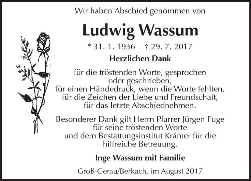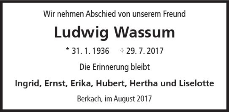 Hier finden Sie alle Traueranzeigen aus der Zeitung, die bisher für Ludwig Wassum erschienen sind. Weitere Traueranzeigen, die in der Zeitung erscheinen, werden hier ebenfalls aufgelistet