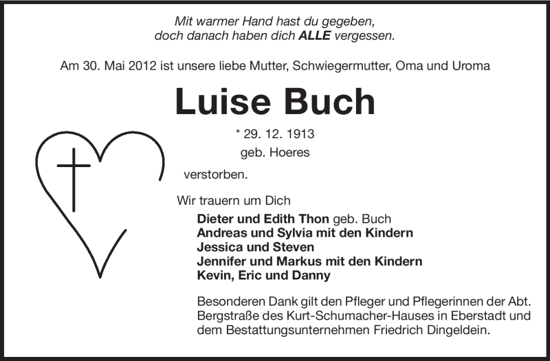 Hier finden Sie alle Traueranzeigen aus der Zeitung, die bisher für Luise Buch erschienen sind. Weitere Traueranzeigen, die in der Zeitung erscheinen, werden hier ebenfalls aufgelistet