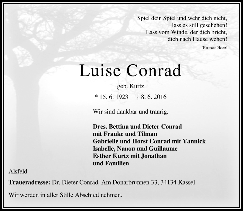 Hier finden Sie alle Traueranzeigen aus der Zeitung, die bisher für Luise Conrad erschienen sind. Weitere Traueranzeigen, die in der Zeitung erscheinen, werden hier ebenfalls aufgelistet
