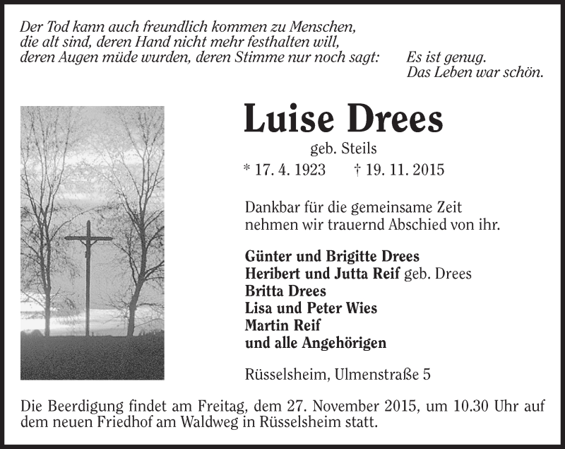 Hier finden Sie alle Traueranzeigen aus der Zeitung, die bisher für Luise Drees erschienen sind. Weitere Traueranzeigen, die in der Zeitung erscheinen, werden hier ebenfalls aufgelistet