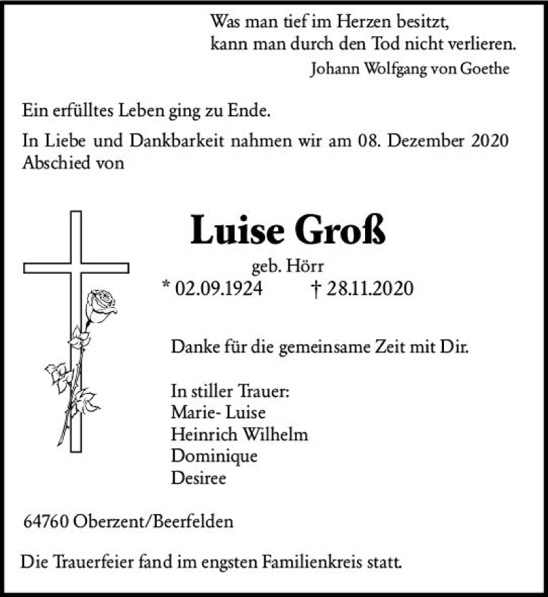 Hier finden Sie alle Traueranzeigen aus der Zeitung, die bisher für Luise Groß erschienen sind. Weitere Traueranzeigen, die in der Zeitung erscheinen, werden hier ebenfalls aufgelistet