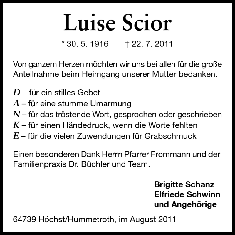 Hier finden Sie alle Traueranzeigen aus der Zeitung, die bisher für Luise Scior erschienen sind. Weitere Traueranzeigen, die in der Zeitung erscheinen, werden hier ebenfalls aufgelistet