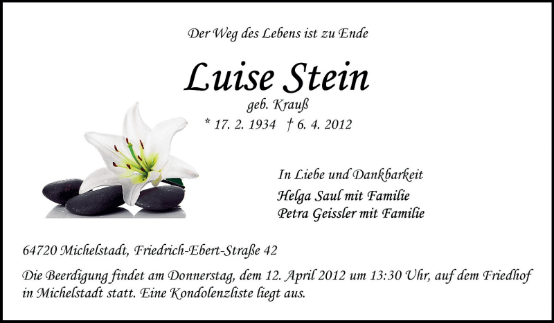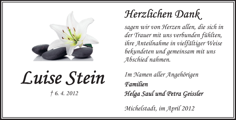 Hier finden Sie alle Traueranzeigen aus der Zeitung, die bisher für Luise Stein erschienen sind. Weitere Traueranzeigen, die in der Zeitung erscheinen, werden hier ebenfalls aufgelistet