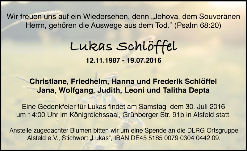 Hier finden Sie alle Traueranzeigen aus der Zeitung, die bisher für Lukas Schlöffel erschienen sind. Weitere Traueranzeigen, die in der Zeitung erscheinen, werden hier ebenfalls aufgelistet