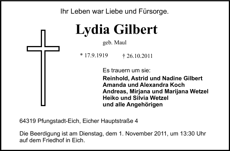 Hier finden Sie alle Traueranzeigen aus der Zeitung, die bisher für Lydia Gilbert erschienen sind. Weitere Traueranzeigen, die in der Zeitung erscheinen, werden hier ebenfalls aufgelistet