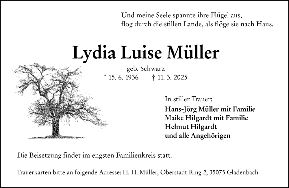 Hier finden Sie alle Traueranzeigen aus der Zeitung, die bisher für Lydia Luise Müller erschienen sind. Weitere Traueranzeigen, die in der Zeitung erscheinen, werden hier ebenfalls aufgelistet