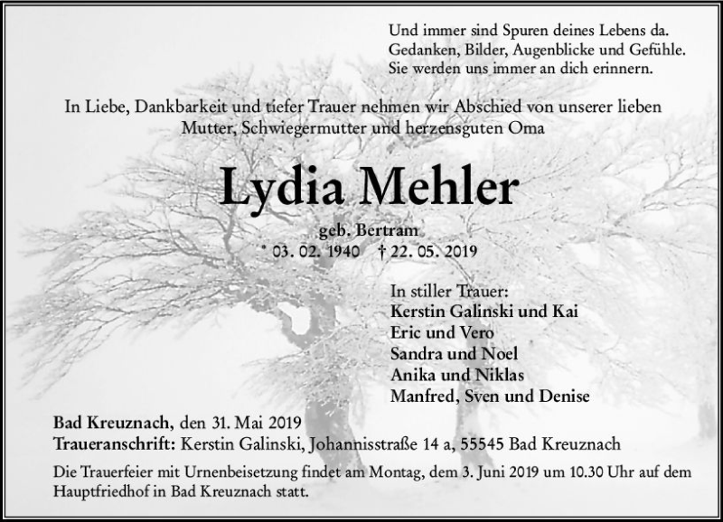 Hier finden Sie alle Traueranzeigen aus der Zeitung, die bisher für Lydia Mehler erschienen sind. Weitere Traueranzeigen, die in der Zeitung erscheinen, werden hier ebenfalls aufgelistet