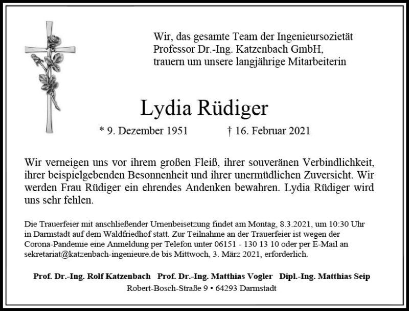 Hier finden Sie alle Traueranzeigen aus der Zeitung, die bisher für Lydia Rüdiger erschienen sind. Weitere Traueranzeigen, die in der Zeitung erscheinen, werden hier ebenfalls aufgelistet