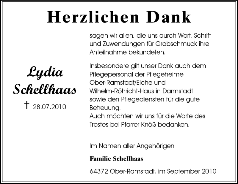 Hier finden Sie alle Traueranzeigen aus der Zeitung, die bisher für Lydia Schellhaas erschienen sind. Weitere Traueranzeigen, die in der Zeitung erscheinen, werden hier ebenfalls aufgelistet