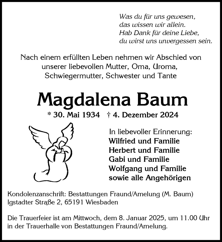Hier finden Sie alle Traueranzeigen aus der Zeitung, die bisher für Magdalena Baum erschienen sind. Weitere Traueranzeigen, die in der Zeitung erscheinen, werden hier ebenfalls aufgelistet