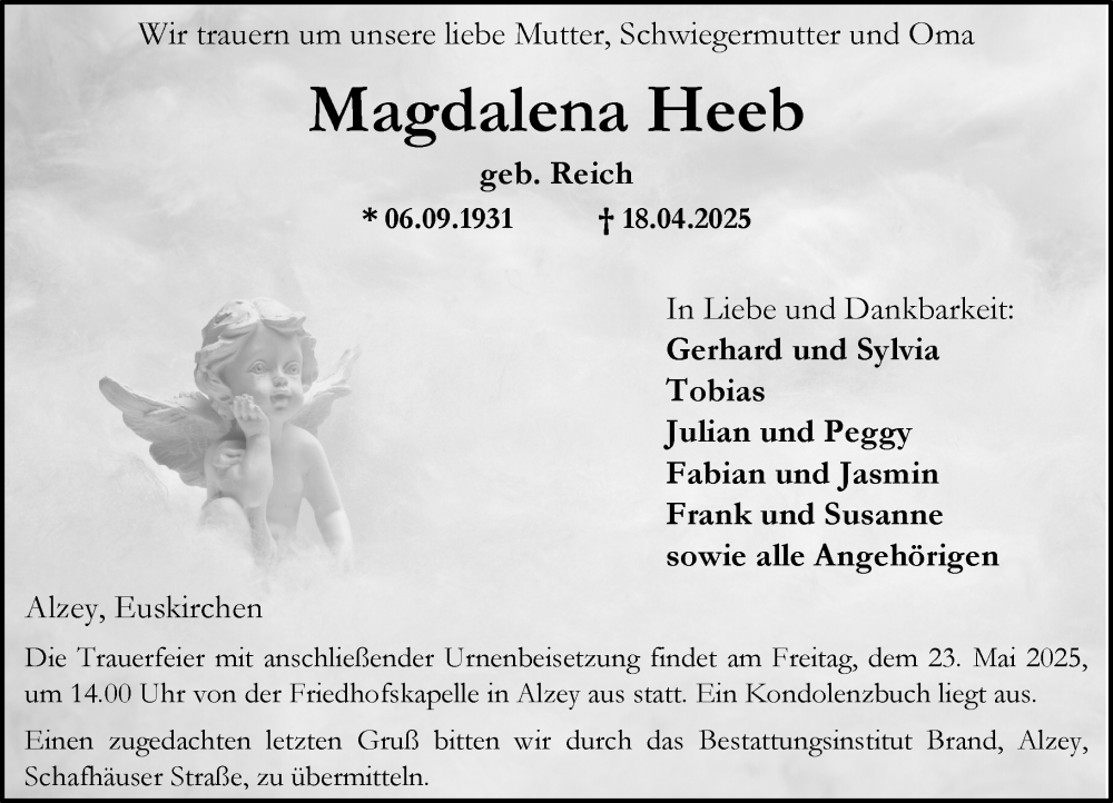 Hier finden Sie alle Traueranzeigen aus der Zeitung, die bisher für Magdalena Heeb erschienen sind. Weitere Traueranzeigen, die in der Zeitung erscheinen, werden hier ebenfalls aufgelistet