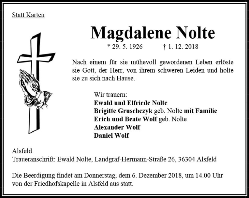 Hier finden Sie alle Traueranzeigen aus der Zeitung, die bisher für Magdalene Nolte erschienen sind. Weitere Traueranzeigen, die in der Zeitung erscheinen, werden hier ebenfalls aufgelistet
