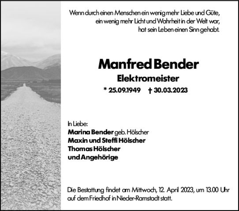 Hier finden Sie alle Traueranzeigen aus der Zeitung, die bisher für Manfred Bender erschienen sind. Weitere Traueranzeigen, die in der Zeitung erscheinen, werden hier ebenfalls aufgelistet