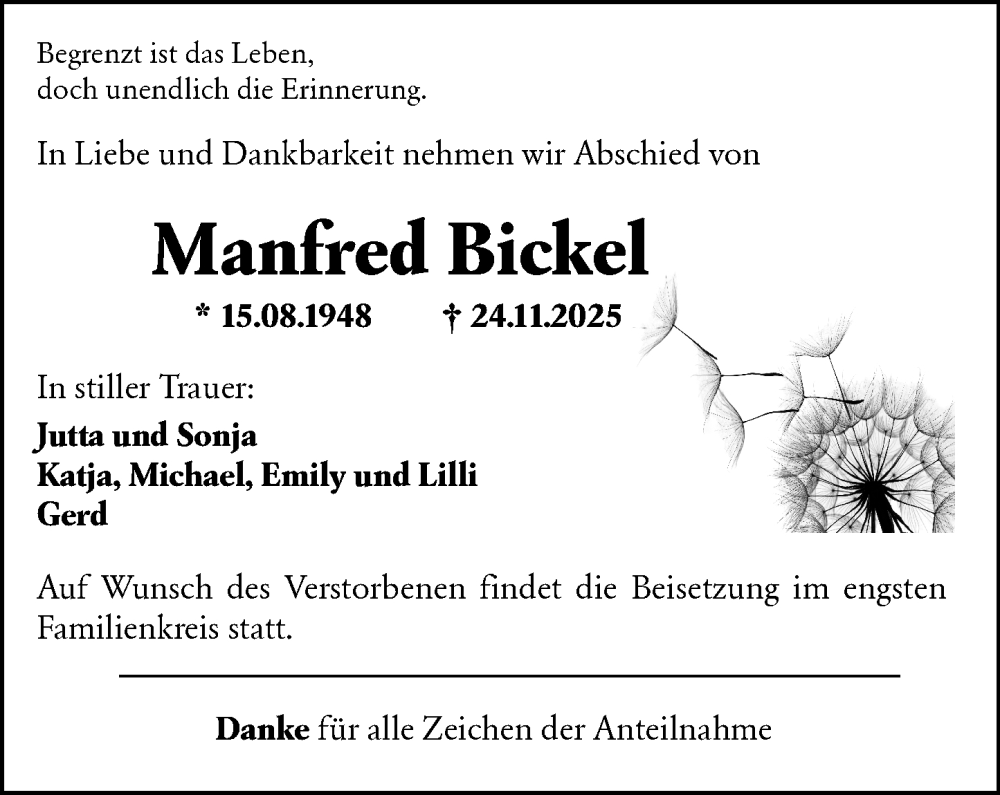 Hier finden Sie alle Traueranzeigen aus der Zeitung, die bisher für Manfred Bickel erschienen sind. Weitere Traueranzeigen, die in der Zeitung erscheinen, werden hier ebenfalls aufgelistet