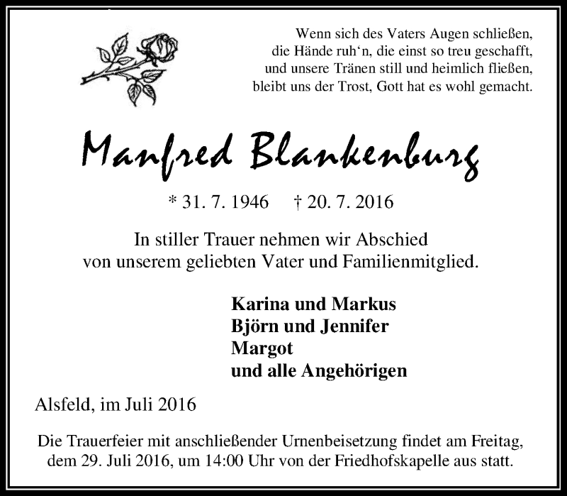 Hier finden Sie alle Traueranzeigen aus der Zeitung, die bisher für Manfred Blankenburg erschienen sind. Weitere Traueranzeigen, die in der Zeitung erscheinen, werden hier ebenfalls aufgelistet