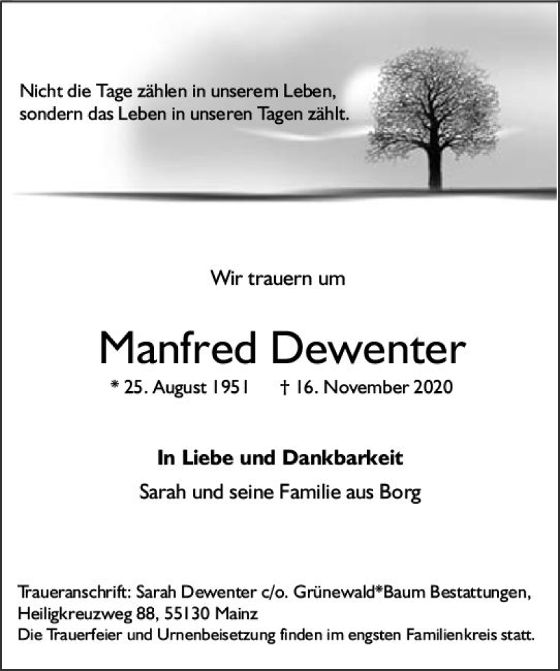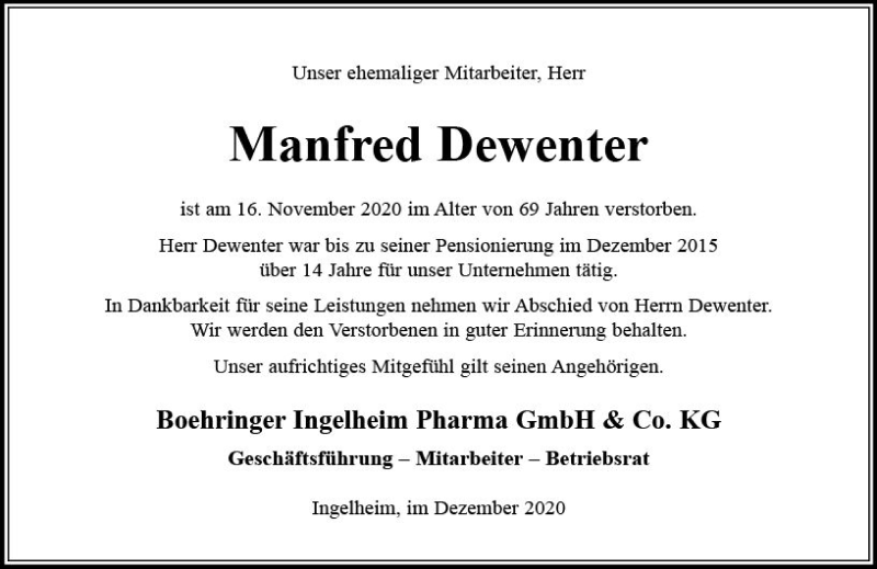 Hier finden Sie alle Traueranzeigen aus der Zeitung, die bisher für Manfred Dewenter erschienen sind. Weitere Traueranzeigen, die in der Zeitung erscheinen, werden hier ebenfalls aufgelistet