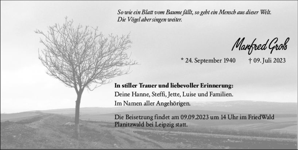 Hier finden Sie alle Traueranzeigen aus der Zeitung, die bisher für Manfred Groß erschienen sind. Weitere Traueranzeigen, die in der Zeitung erscheinen, werden hier ebenfalls aufgelistet