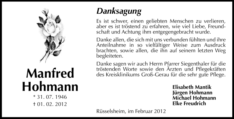 Hier finden Sie alle Traueranzeigen aus der Zeitung, die bisher für Manfred Hohmann erschienen sind. Weitere Traueranzeigen, die in der Zeitung erscheinen, werden hier ebenfalls aufgelistet