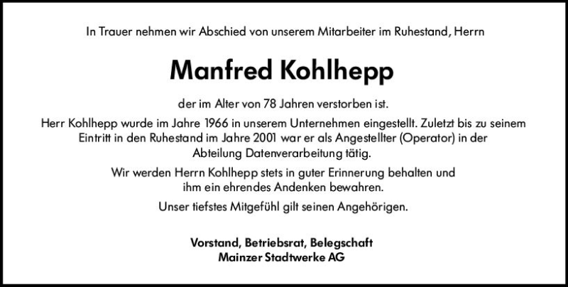 Hier finden Sie alle Traueranzeigen aus der Zeitung, die bisher für Manfred Kohlhepp erschienen sind. Weitere Traueranzeigen, die in der Zeitung erscheinen, werden hier ebenfalls aufgelistet