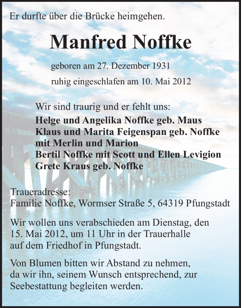 Hier finden Sie alle Traueranzeigen aus der Zeitung, die bisher für Manfred Noffke erschienen sind. Weitere Traueranzeigen, die in der Zeitung erscheinen, werden hier ebenfalls aufgelistet