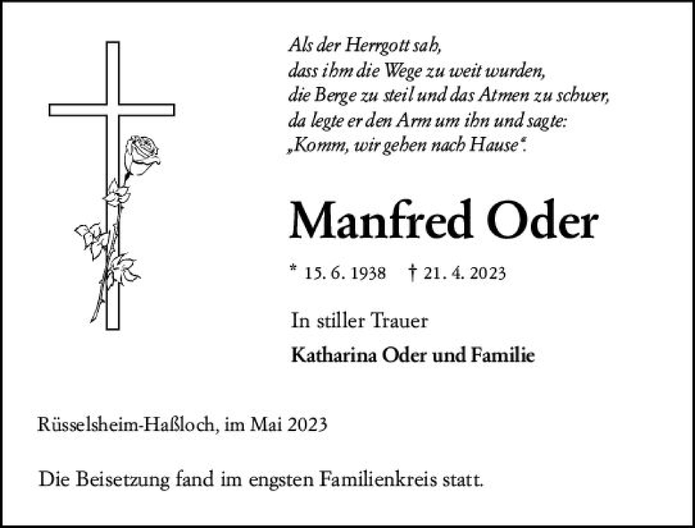 Hier finden Sie alle Traueranzeigen aus der Zeitung, die bisher für Manfred Oder erschienen sind. Weitere Traueranzeigen, die in der Zeitung erscheinen, werden hier ebenfalls aufgelistet