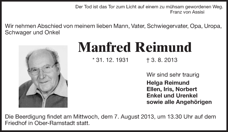 Hier finden Sie alle Traueranzeigen aus der Zeitung, die bisher für Manfred Reimund erschienen sind. Weitere Traueranzeigen, die in der Zeitung erscheinen, werden hier ebenfalls aufgelistet