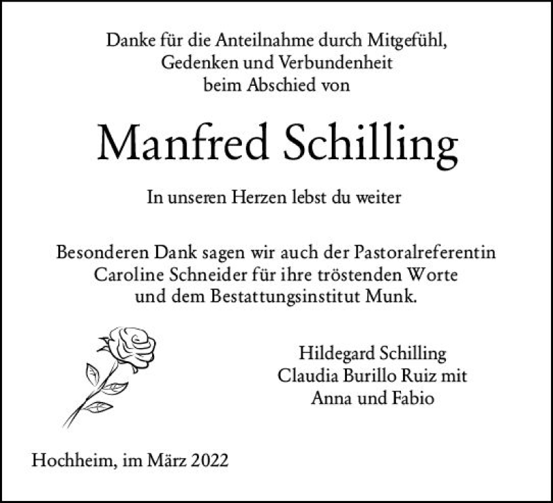 Hier finden Sie alle Traueranzeigen aus der Zeitung, die bisher für Manfred Schilling erschienen sind. Weitere Traueranzeigen, die in der Zeitung erscheinen, werden hier ebenfalls aufgelistet