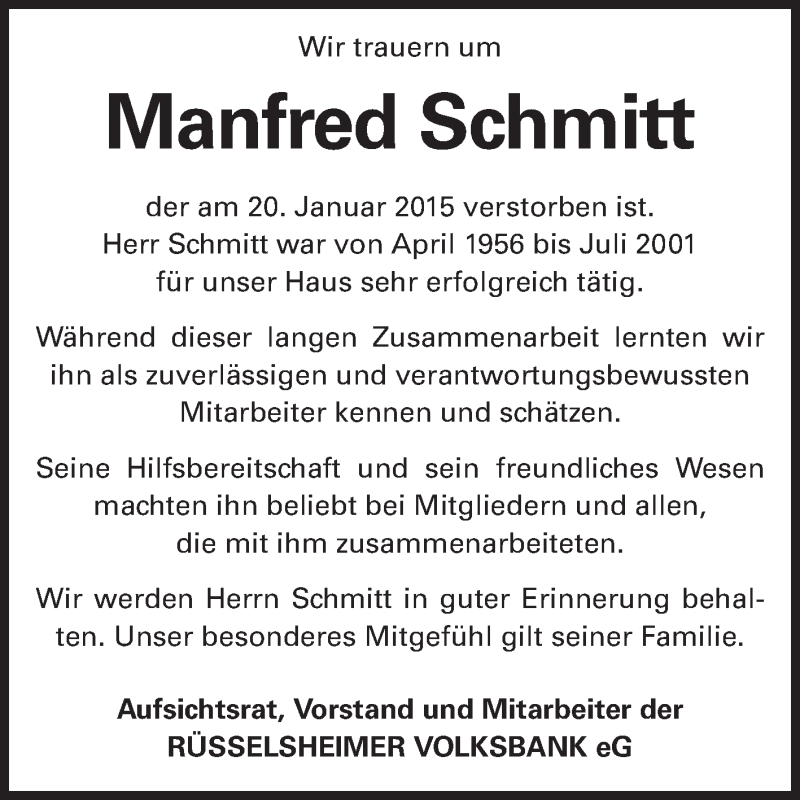 Hier finden Sie alle Traueranzeigen aus der Zeitung, die bisher für Manfred Schmitt erschienen sind. Weitere Traueranzeigen, die in der Zeitung erscheinen, werden hier ebenfalls aufgelistet