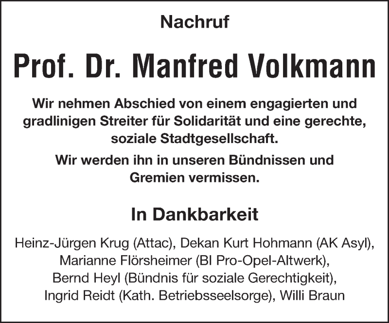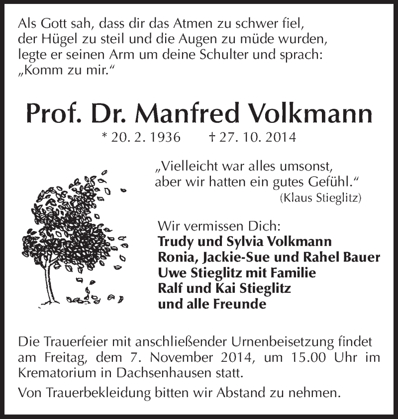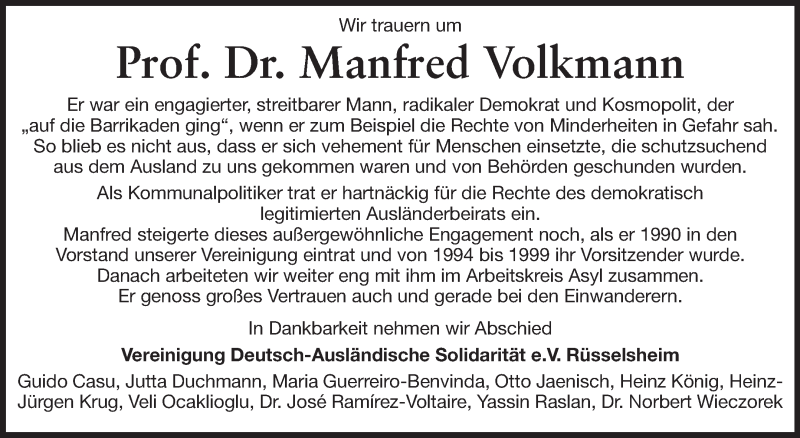 Hier finden Sie alle Traueranzeigen aus der Zeitung, die bisher für Manfred Volkmann erschienen sind. Weitere Traueranzeigen, die in der Zeitung erscheinen, werden hier ebenfalls aufgelistet
