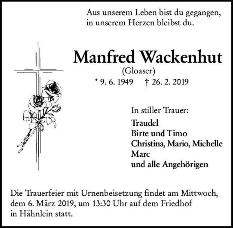 Hier finden Sie alle Traueranzeigen aus der Zeitung, die bisher für Manfred Wackenhut erschienen sind. Weitere Traueranzeigen, die in der Zeitung erscheinen, werden hier ebenfalls aufgelistet