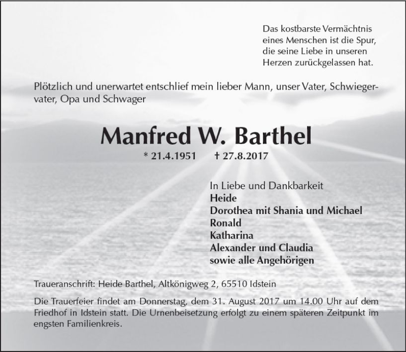 Hier finden Sie alle Traueranzeigen aus der Zeitung, die bisher für Manfred W. Barthel erschienen sind. Weitere Traueranzeigen, die in der Zeitung erscheinen, werden hier ebenfalls aufgelistet