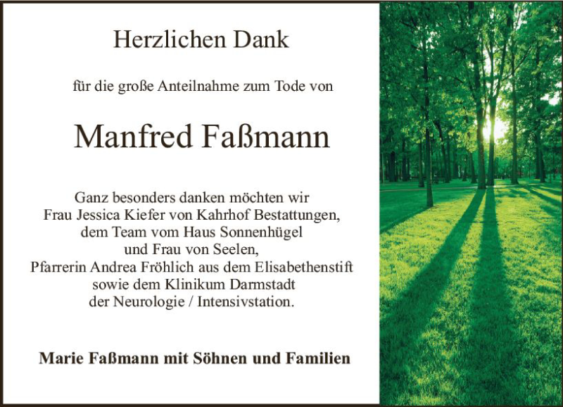 Hier finden Sie alle Traueranzeigen aus der Zeitung, die bisher für Mannfred Faßmann erschienen sind. Weitere Traueranzeigen, die in der Zeitung erscheinen, werden hier ebenfalls aufgelistet
