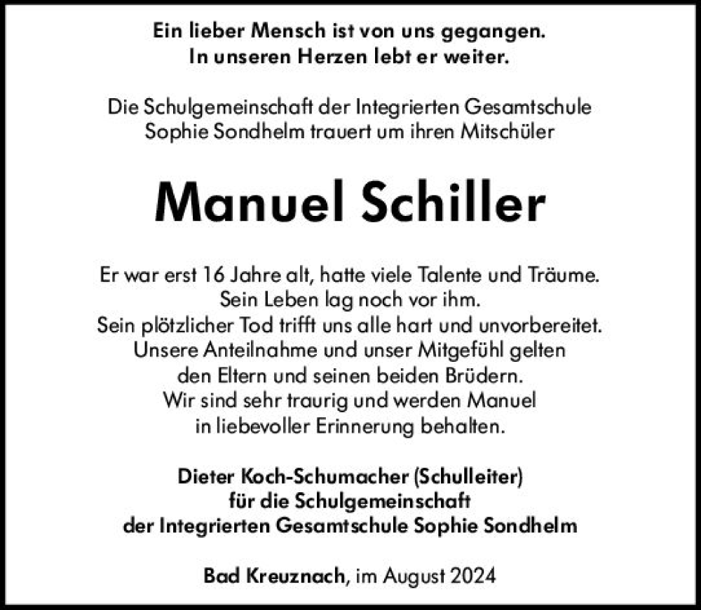 Hier finden Sie alle Traueranzeigen aus der Zeitung, die bisher für Manuel Schiller erschienen sind. Weitere Traueranzeigen, die in der Zeitung erscheinen, werden hier ebenfalls aufgelistet