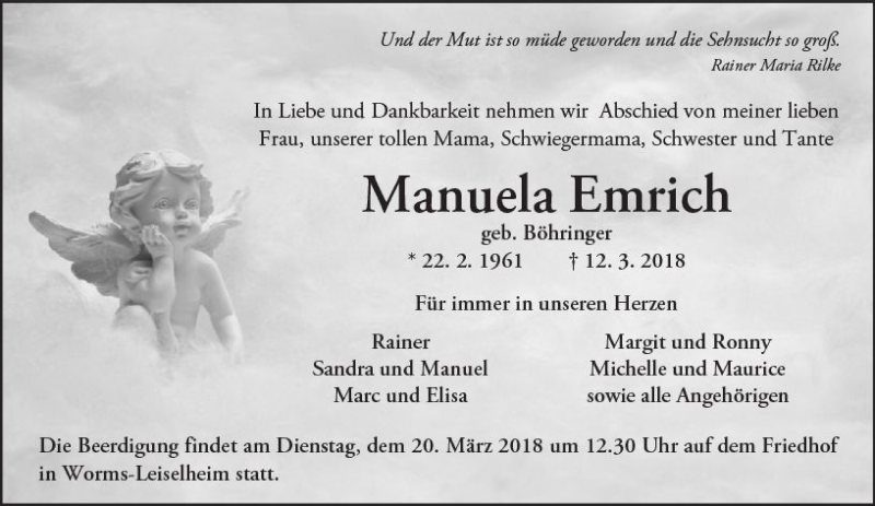 Hier finden Sie alle Traueranzeigen aus der Zeitung, die bisher für Manuela Emrich erschienen sind. Weitere Traueranzeigen, die in der Zeitung erscheinen, werden hier ebenfalls aufgelistet