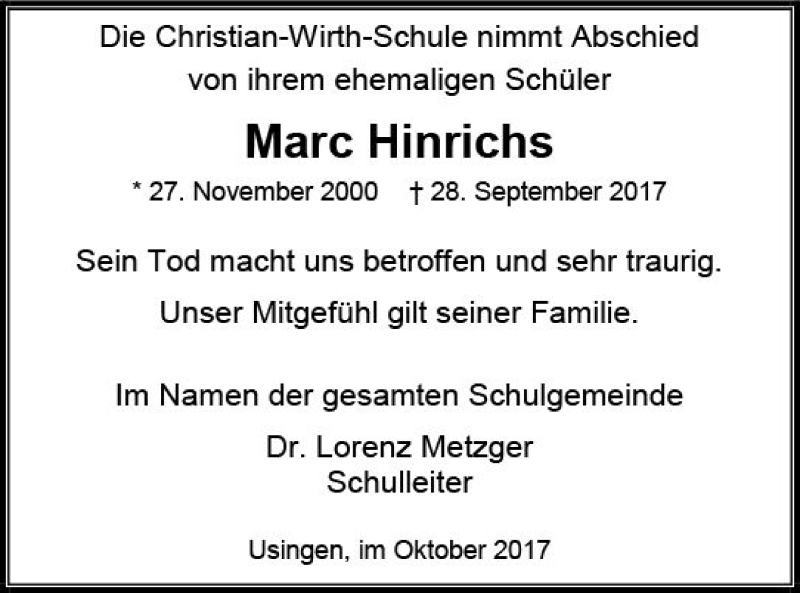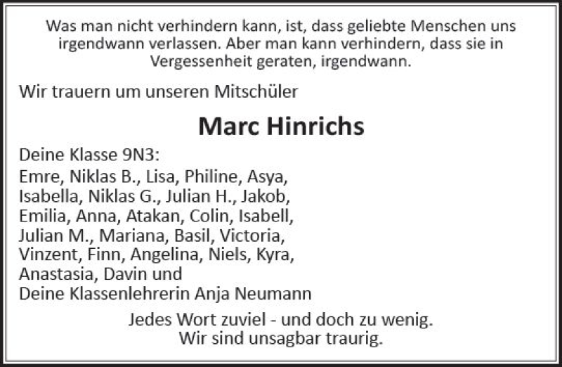 Hier finden Sie alle Traueranzeigen aus der Zeitung, die bisher für Marc Hinrichs erschienen sind. Weitere Traueranzeigen, die in der Zeitung erscheinen, werden hier ebenfalls aufgelistet
