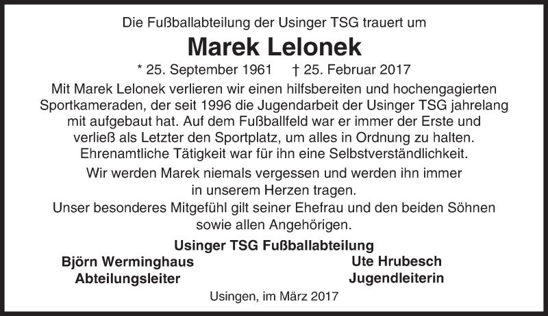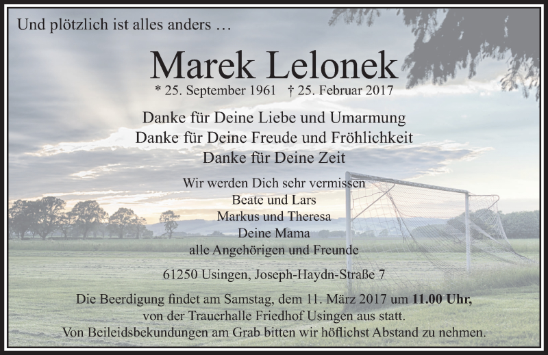 Hier finden Sie alle Traueranzeigen aus der Zeitung, die bisher für Marek Lelonek erschienen sind. Weitere Traueranzeigen, die in der Zeitung erscheinen, werden hier ebenfalls aufgelistet