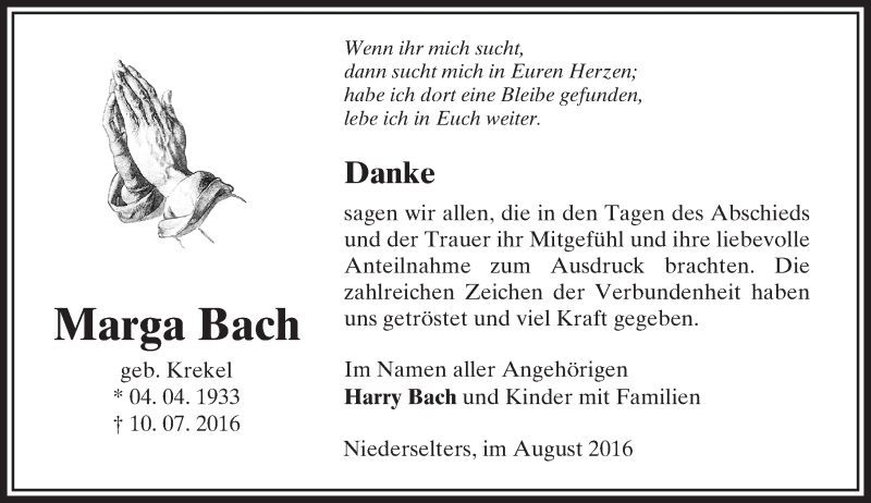 Hier finden Sie alle Traueranzeigen aus der Zeitung, die bisher für Marga Bach erschienen sind. Weitere Traueranzeigen, die in der Zeitung erscheinen, werden hier ebenfalls aufgelistet